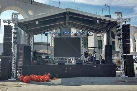 Estrutura em alumínio, palco, tablado, gradil e pirâmides para criar um ambiente seguro e visualmente impactante.