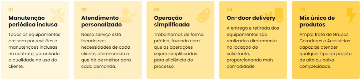 Trabalhamos com locação de grupos geradores de energia, trifásico, diesel e silenciado, nas potências de 55 a 600 kVA, sendo o maior diferencial o aluguel de geradores de energia novos, dos maiores fabricantes mundiais.
